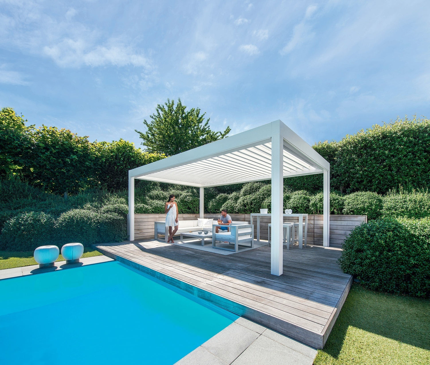 Decorvibe bioklimatska pergola izrađena je u cijelosti od aluminija i nehrđajućeg čelika. Dizajnirana je za sve vremenske uvjete i posebno je prilagođena promjenjivim uvjetima obalnih lokacija. S Decorvibe bioklimatskom pergolom možete kontrolirati i podešavati sunce, sjenu i svjetlost u svom domu po želji. DELUX i NATURA bioklimatske pergole također pružaju ventilaciju (protok zraka) i zaštitu od kiše, što ih čini idealnim za provođenje slobodnog vremena u vrtu, terasi, verandi, uz bazen ili u vanjskoj kuhinji. Učinite svoj boravak na otvorenom kvalitetnim iskustvom!
